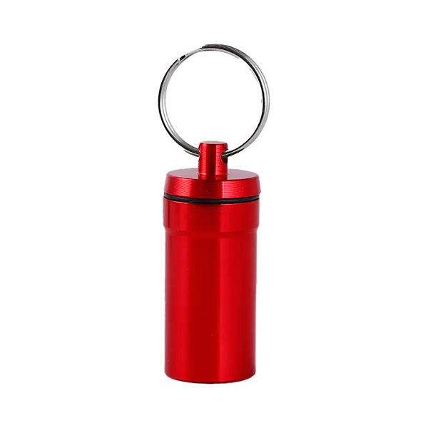 Llavero metálico tipo frasco pastillero. Presentación en bolsa plástica individual.