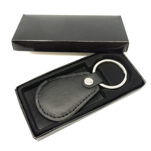 Llavero símil cuero color negro. Presentación en estuche de cartón laminado color negro con cuna interior de terciopelo.