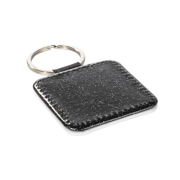 Llavero cuadrado símil cuero para sublimación. Presentación en estuche de cartón laminado color negro con cuna interior de terciopelo. Tamaño: 51 x 51 x 5 mm. Argolla : Ø 32 mm.