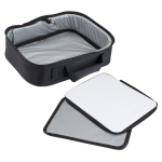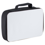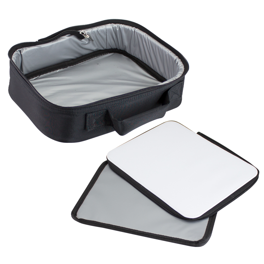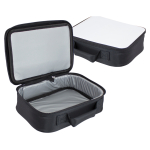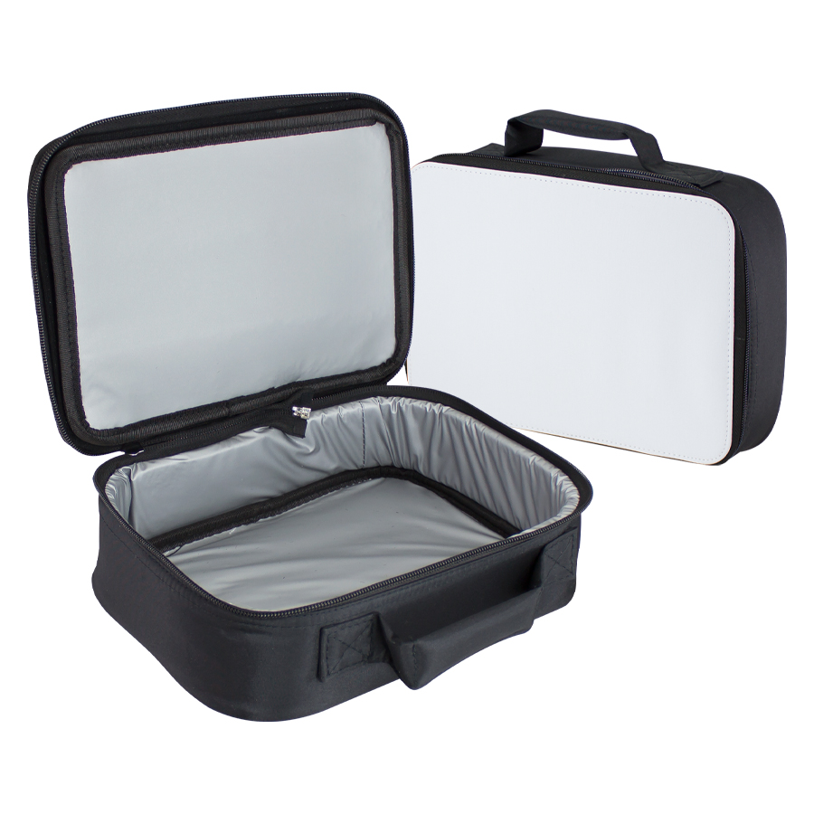 Lonchera de Microfibra, con interior cooler con aislante térmico plateado. Incluye mango y tapa dura en tela blanca para Sublimación a todo color. Cierre eclair. 25 x 19 x 7.5 cm aprox.