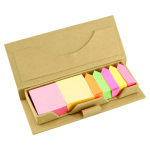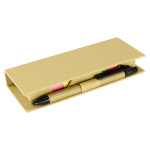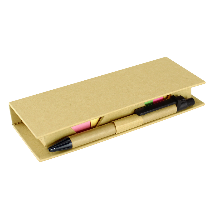 Memo Set Ecológico con Bolígrafo Memo Set Ecológico. Incluye Bolígrafo Ecológico corto + 125 banderitas adhesivas de colores + 25 notas adhesivas cuadradas + Block de Notas 40 hojas blancas. Tapas gruesas cartón ecológico 600gsm, exterior liso/interior plisado, en Espiral Doble Cero Metálico.8 x 10.5 x 1.5 cm.