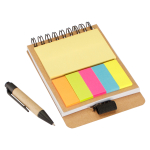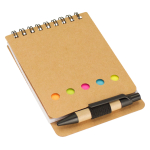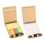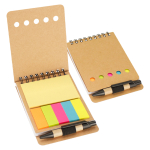 Memo Set Ecológico con Bolígrafo Memo Set Ecológico. Incluye Bolígrafo Ecológico corto + 125 banderitas adhesivas de colores + 25 notas adhesivas cuadradas + Block de Notas 40 hojas blancas. Tapas gruesas cartón ecológico 600gsm, exterior liso/interior plisado, en Espiral Doble Cero Metálico.8 x 10.5 x 1.5 cm.