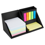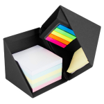 Memo set Ecológico retráctil con forma de Cubo en Cartón. Incluye 500 hojas de notas cuadradas de colores, 50 notas adhesivas amarillas medianas, 125 banderitas adhesivas de colores y un compartimento porta-lápices.