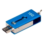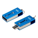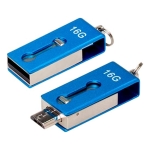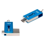 Mini-Pendrive 2.0 dual OTG-ANDROID con 16GB de memoria, con cuerpo y carcasa metálica de giro. Con sistema OTG dual, terminales USB y Micro USB, para conectar directamente al computador o al teléfono celular Android. Presentación en práctico blister de cartón reciclado con ranura para ganchera, y estuche plástico translúcido para remover el pendrive directamente.