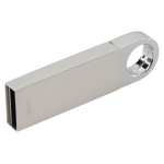 Mini-Pendrive USB 2.0 con 32GB de memoria, cuerpo metálico y espacio redondo para colgar. Presentación en práctico blister de cartón reciclado con ranura para ganchera, y estuche plástico translúcido para remover el pendrive directamente.