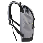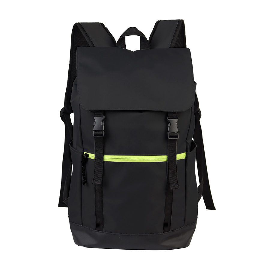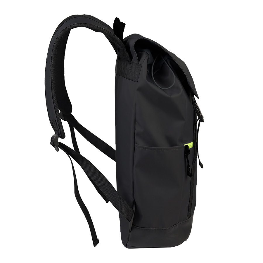 Mochila impermeable modelo «HARLEM». Fabricada en tela impermeable Poliéster Memory 75D + PU 210/D. Capacidad 9 litros, tamaño 29 x 46 x 14.5 cm. Incluye solapa y cierre delantero con cinta reflectante amarilla, bolsillo delantero + 2 bolsillos laterales. Interior acolchado. 29 x 46 x 14.5 cm. aprox.