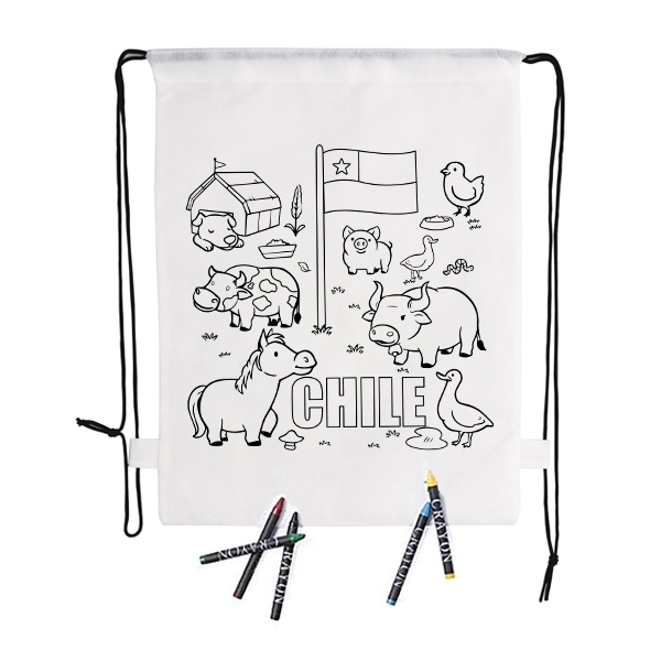 Mochila de non-woven en color blanco especialmente diseñada para colorear con ceras. Incluye 5 ceras de cuerpo cilíndrico en variados colores. Con cuerdas autocierre en color negro y refuerzo en las esquinas.30x 25 cm | 47 gr.