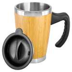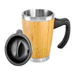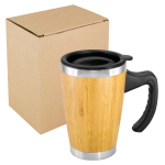 Mug de madera de Bamboo con asa plástica negra, interior de Acero Inoxidable. Tapa plástica negra con dosificador. Presentación en caja de cartón forrado natural.
