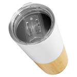 Mug de metálico doble pared aislante, interior Acero inoxidable 201 SS, exterior cubierta inferior de bamboo y cubierta superior de Acero inoxidable 304 SS, modelo «AURUS». Producto BPA FREE, para el contacto con líquidos y alimentos. Fondo de silicona negra ABS anti-deslizante. Tapa removible de plástico PS Crystal Clear con sello cilíndrico de silicona y sistema de cierre/apertura antiderrame. Capacidad 500ml. Presentación en bolsa OPP + caja de regalo de cartón kraft.