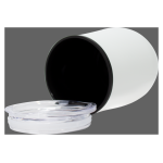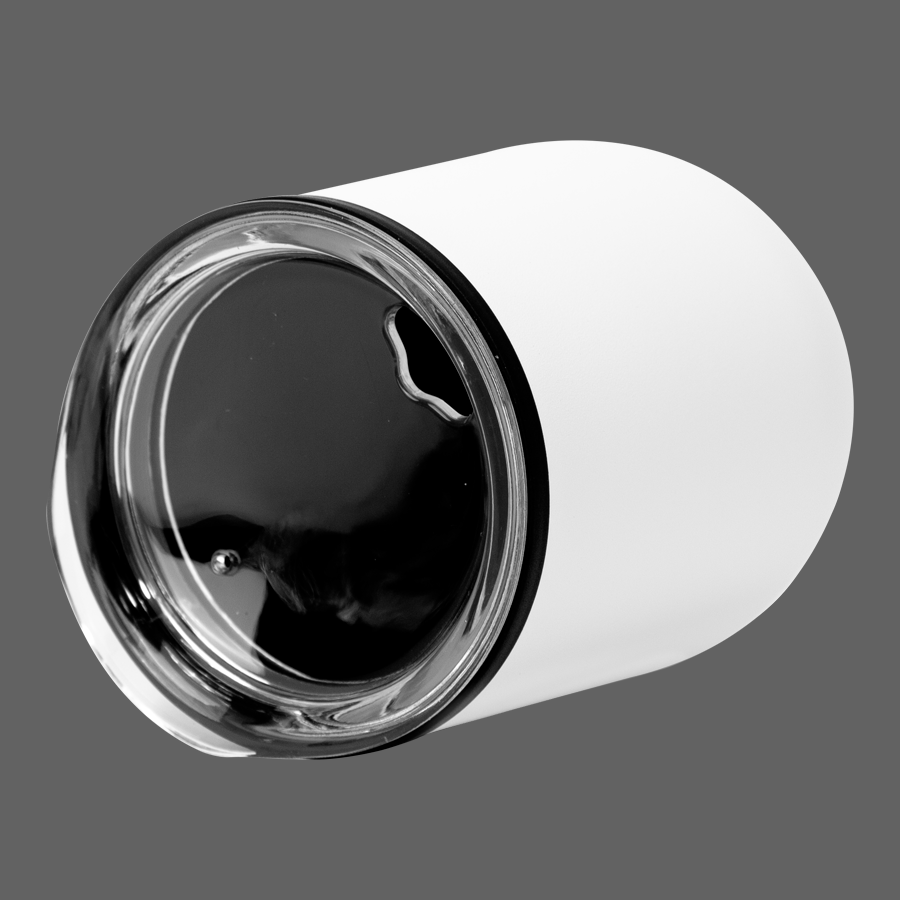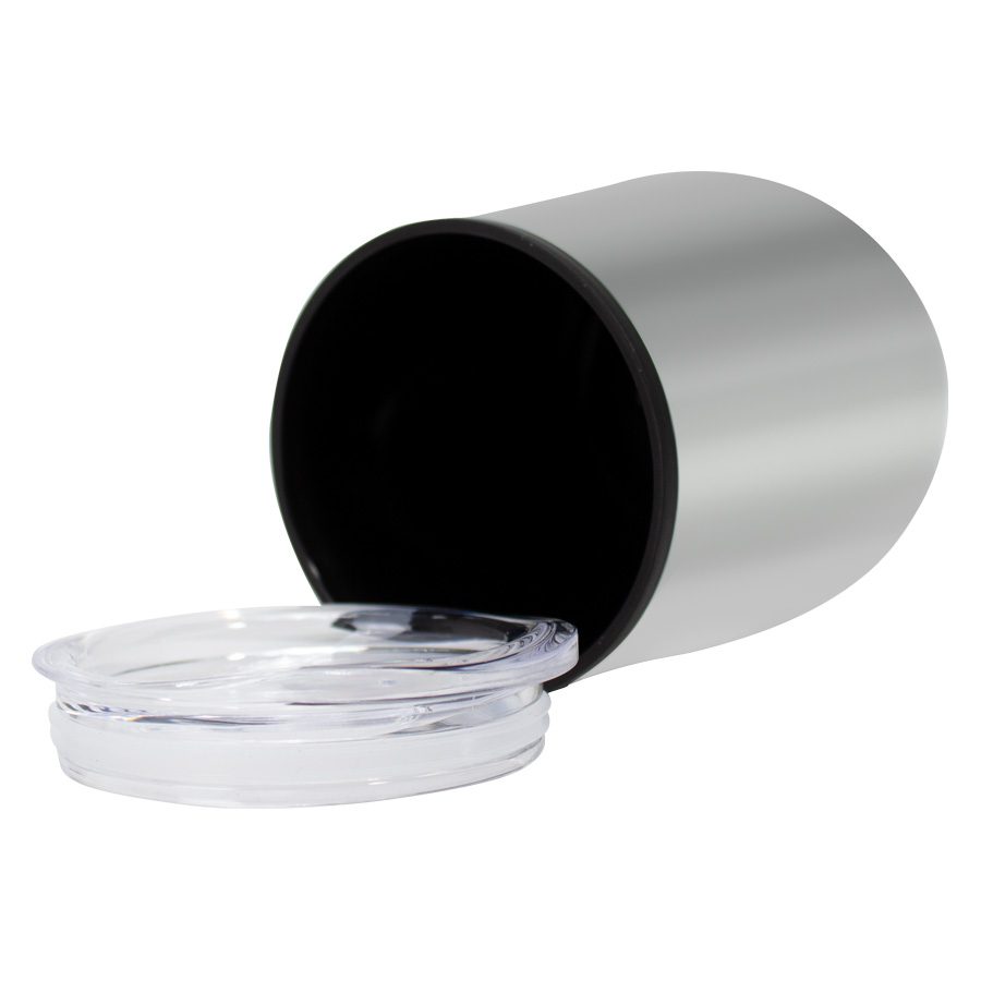 Mug metálico doble pared aislante, interior plástico PP, exterior Acero inoxidable 201 SS, recubierto con pintura POWDER COAT, modelo «SYNNA». Producto BPA FREE, para el contacto con líquidos y alimentos. Fondo de silicona negra ABS anti-deslizante. Tapa removible de plástico PS Crystal Clear con sello cilíndrico de silicona. Capacidad 350ml. Presentación en bolsa PP + caja de regalo de cartón negro.