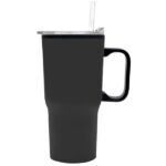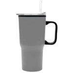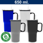 Atractivo mug de acero inoxidable, interior Plástico, tapón de rosca anti derrame de plástico transparente. Acabado mate. Presentación caja individual color Kraft Doble pared aislante, tapa rosca con dosificador con silicona antiderrame, incluye bombilla. 650 ml. No usar con bebidas carbonatadas.