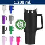 Atractivo mug de acero inoxidable, interior en acero inoxidable, tapón de rosca anti derrame de plástico transparente. Presentación caja individual color Negra Doble pared aislante, tapa rosca con dosificador, incluye bombilla. 1.200.ml.No usar con bebidas carbonatadas.