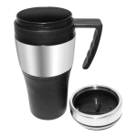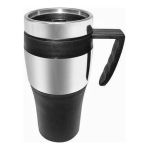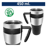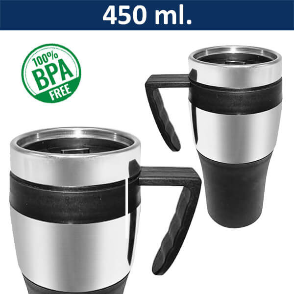 Mug térmico de acero inoxidable con tapa rosca y dosificador. Capacidad de 450ml. Doble pared aislante. Interior PVC negro.