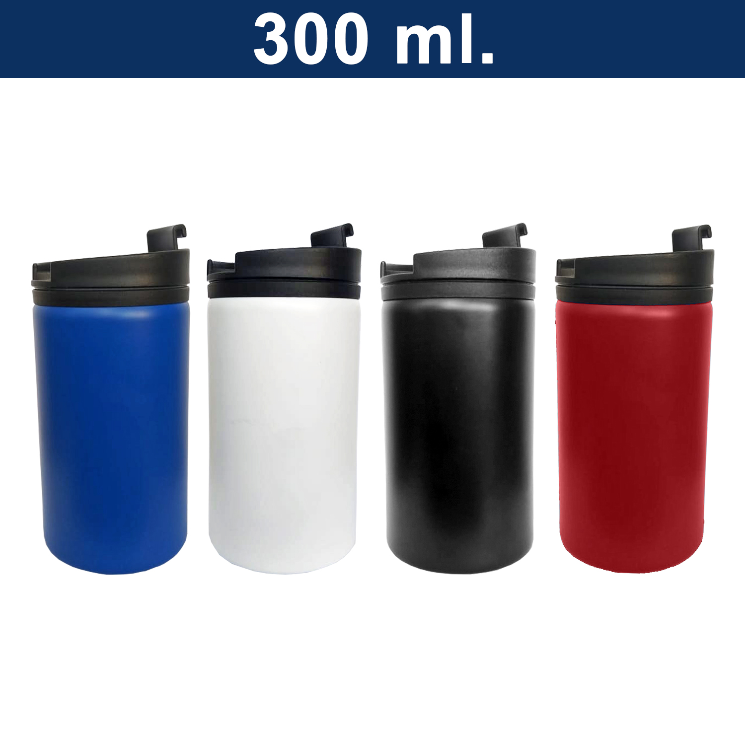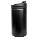 Mug metálico de cuerpo negro. Detalle en tapa y argolla en gollete del mismo color. Exterior de acero inoxidable SS 201 e interior plástico negro. Base antideslizante. Capacidad de 300 ml. Presentación en caja negra.