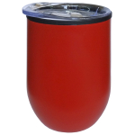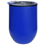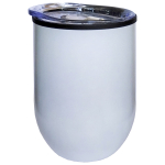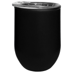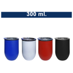 Atractivo mug metálico con tapón de rosca anti derrame de plástico transparente. Interior plástico y exterior de acero inoxidable SS 201. Base antideslizante. Capacidad 350 ml. Presentación en caja negra.