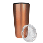 Mug metálico color cobre electro-plateado. Presentación en bolsa plástica dentro de caja de cartón negra. 600 ml. Interior y tapa de plástico. Incluye silicona antiderrame.