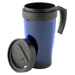 Mug térmico de doble pared aislante con tapa rosca y dosificador. Interior y tapa de PVC negro y exterior de plástico traslúcido.