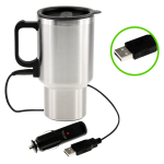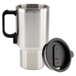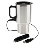 Mug térmico de acero inoxidable de doble pared aislante con tapa plástica negra y dosificador. Con conector USB y al cenicero del automóvil. Presentación en caja de cartón plateado.