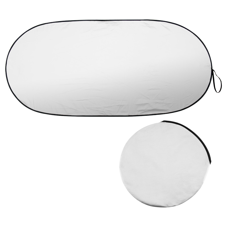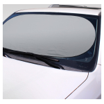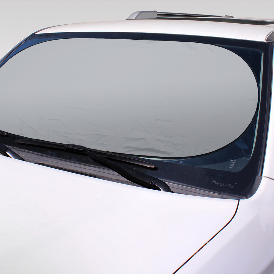 Parasol plegable de nylon plateado para el vehículo. Presentación dentro de funda redonda de nylon plateado. Gran área para impresión. Tamaño: Parasol 130 x 60 cm / Funda Ø 35cm aprox.