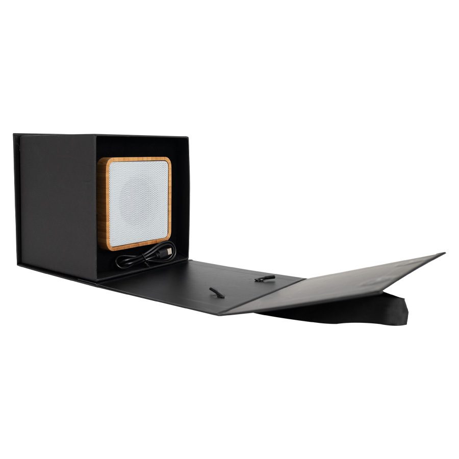 Altavoz inalámbrico con conexión Bluetooth® y 3W potencia. Con carcasa en bambú natural en combinación recubrimiento superior de algodón. De tamaño compacto y con práctica asa de transporte en algodón. Batería de litio de 300mAh, con cable de carga Tipo C incluido. Presentado*Valor para 50 unidades. (Pedido mínimo) Incluye impresión de logo 1 color. *valor neto+ IVA