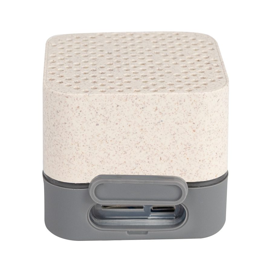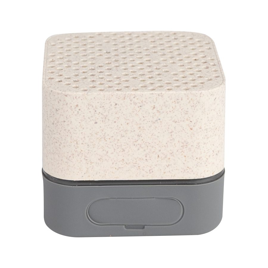 Parlante altavoz de caña de trigo (wheat straw) «LIFE» con juego de luces LED y sección inferior de silicona gris con funciones.