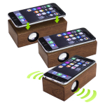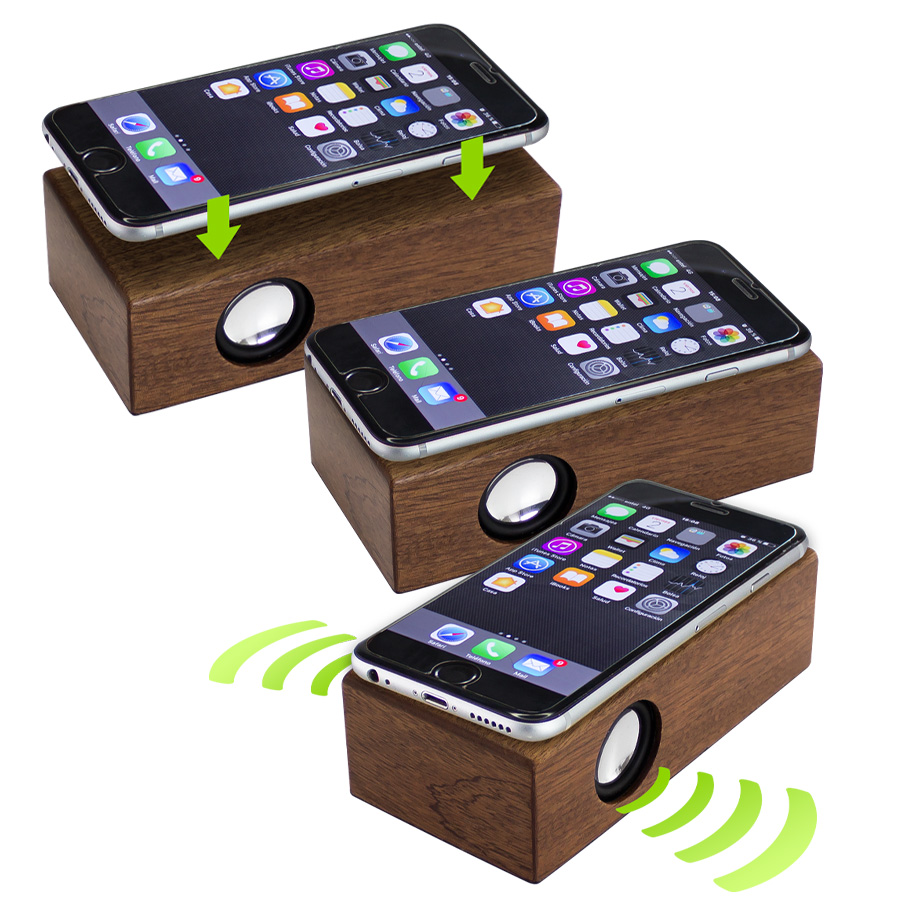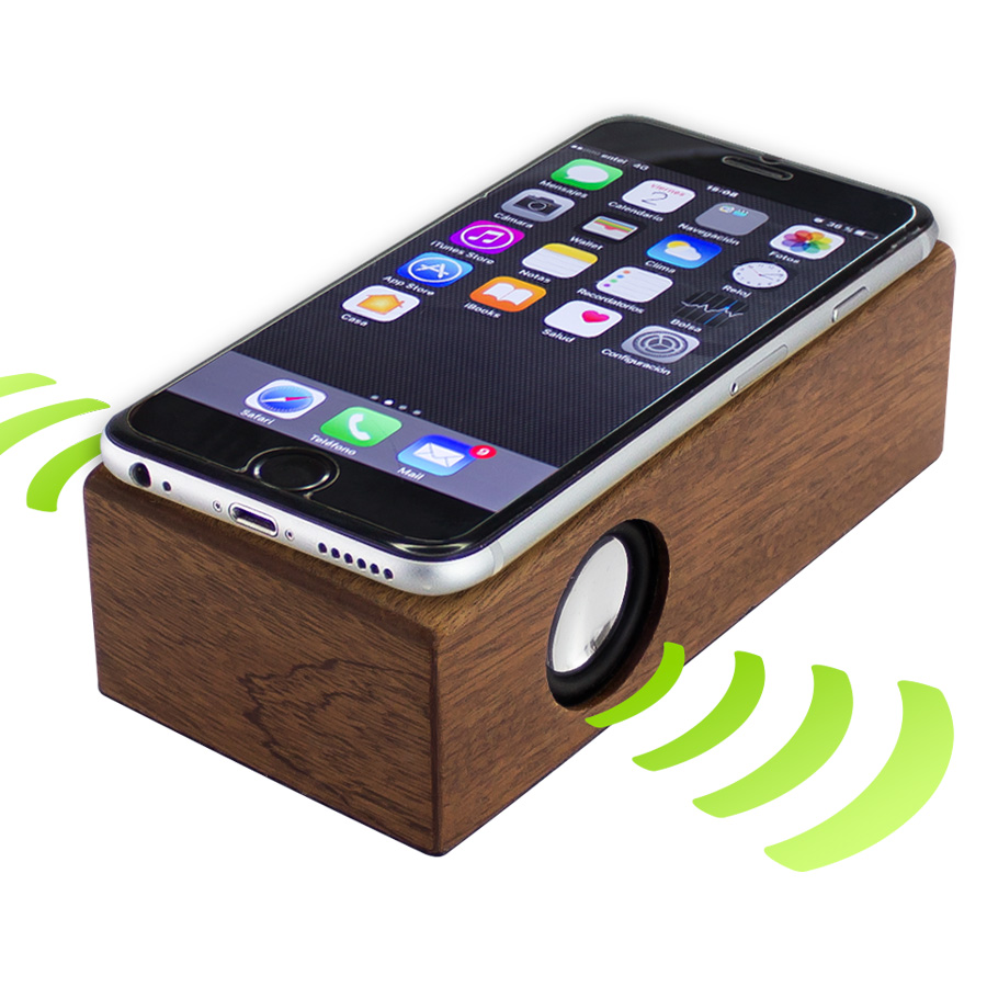 Parlante amplificador de sonido por Inducción, tamaño grande, de madera barnizada de Nogal. Ahora con mayor potencia y mejor calidad de sonido!! No necesita Bluetooth, Wi-Fi o conexión a cable. Amplifica el sonido una vez que se posa el celular sobre él, con un efecto de caja de resonancia. Compatible con cualquier modelo de teléfono celular. Contiene batería de ion-litio recargable incorporada. Incluye cable de sonido y cargador USB.Tamaño: 14.5 x 7.4 x 4.3 cm.