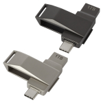 Mini-Pendrive 2.0 dual OTG-ANDROID con 16GB de memoria, con cuerpo y carcasa metálica de giro. Con sistema OTG dual, terminales USB y Micro USB, para conectar directamente al computador o al teléfono celular Android. Presentación en práctico blister de cartón reciclado con ranura para ganchera, y estuche plástico translúcido para remover el pendrive directamente.