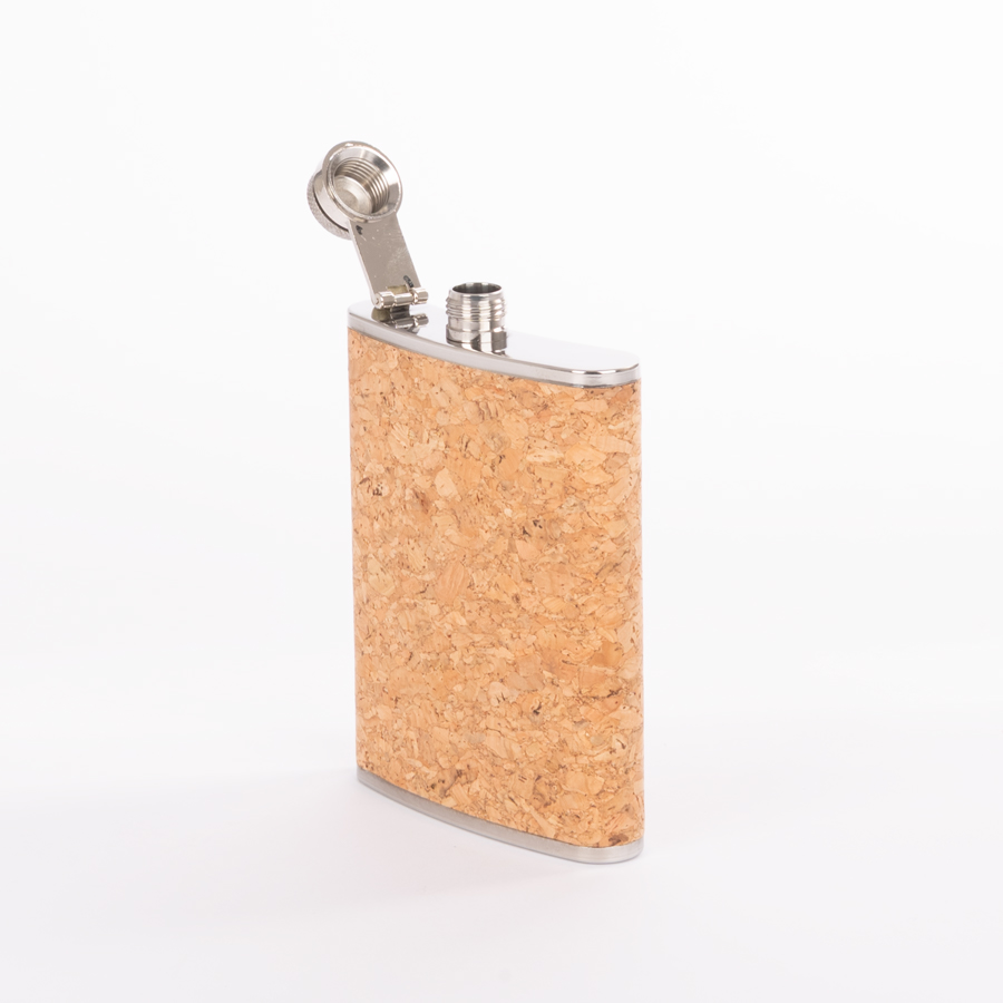 Petaca Licorera de Acero Inoxidable SS304, modelo «CORK», con cubierta de corcho natural. Capacidad 8 oz (237 ml). Presentación en bolsa OPP transparente + caja de cartulina negra. Tamaño: 9.8 x 13.7 x 2.5 cm.