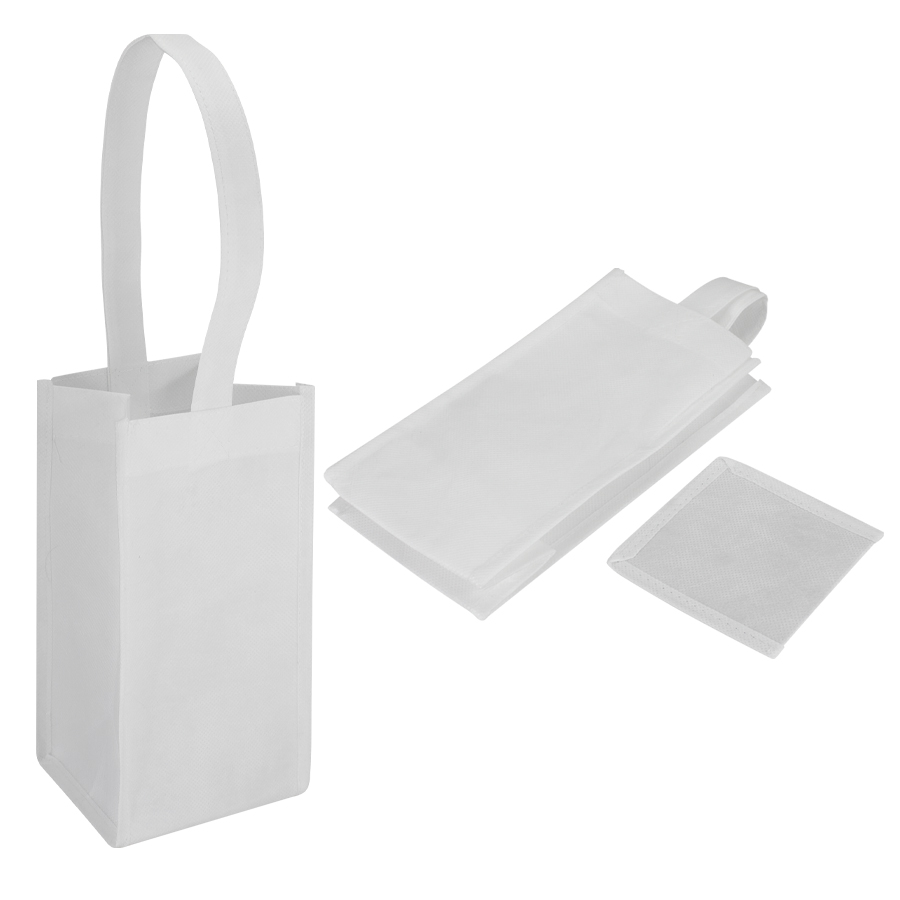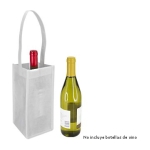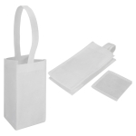 Porta-Botella de vino, para 1 unidad, en tela PET no tejida de 100g/m2. Cuenta con una manilla de 42cm. aprox. Y base de cartón forrado en tela PET no tejida. Ideal para sublimación.12 x 24 x 12 cm / Asa 42 cm aprox.