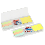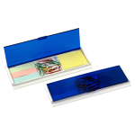 Porta notas adhesivas con clips de colores. Incluye 1 taco de notas adhesivas de 40 hojas de 4,8 x 3,6 cm + 3 tacos de 25 banderitas adhesivas de 4,8 x 1,2 cm + 10 clips recubiertos de colores. Regla de 14 cm y de 5,5″.Mas colores Blanco y Rojo.
