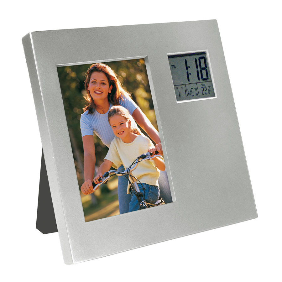 Porta-Retrato de Escritorio para foto de 13 x 9 cm con Estación Meteorológica Digital, incluye Reloj-Alarma-Calendario-Termómetro. Posición Horizontal o Vertical.Tamaño: 17.8 x 17.8 x 1.9 cm.