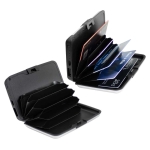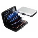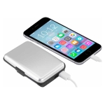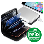 Estuche rígido Porta-Tarjetas (tamaño Tarjeta de Crédito) con protección anti-clonación o Escaneo RFID. Capacidad interior para 6 Tarjetas. Incluye cargador de celular Power Bank de 2.500 mAh, con indicador de carga y cable USB/Micro USB. Presentación en bolsa de polipropileno y Estuche plateado de Regalo.Tamaño: 10.8 x 7.2 cm.