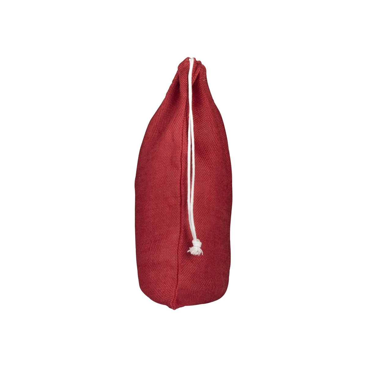 Modelo de saquito grande hecho con fibras de yute en color rojo y cordeles de algodón para cierre. Las fibras de yute entregan resistencia y durabilidad además de una presentación rústica, llamativa y natural.40×30.
