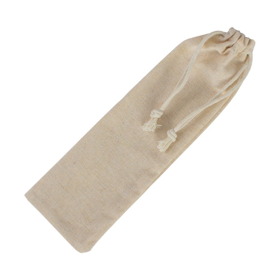 Set de 3 cubiertos de Bamboo de 16cm. de largo c/u, presentados en bolsa de Algodón tipo saco color natural de 22.5 x 7 cm. Cuenta con asa-cordón retraíble de Algodón, en la parte superior de la bolsa. Cubiertos: Cuchillo, Tenedor, Cuchara.