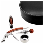 Set de 4 accesorios metálicos para el vino, con terminales de madera barnizada, presentación en estuche redondo de PU negro con tapa.