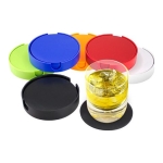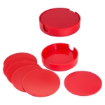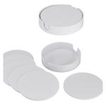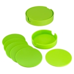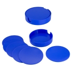 Set de 6 Posavasos Plásticos Redondos de 9.9 cm de diámetro, en plástico ABS de 3 mm de espesor. Contenidos en dispensador redondo del mismo material y color. Presentación en caja de cartulina blanca.