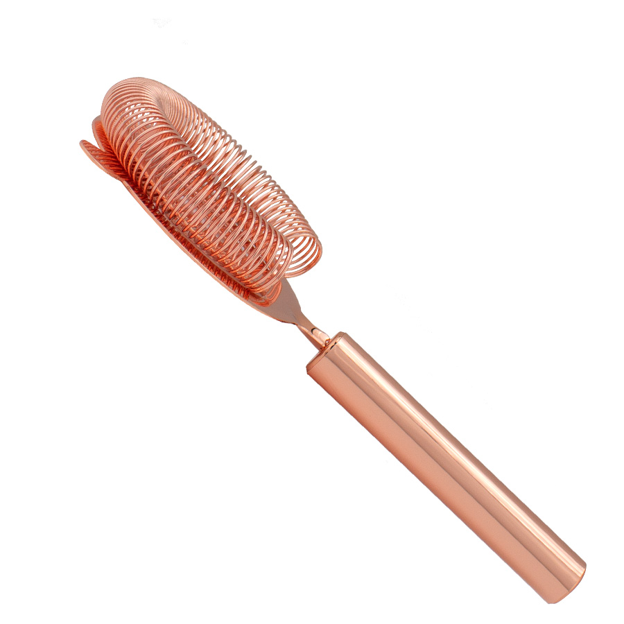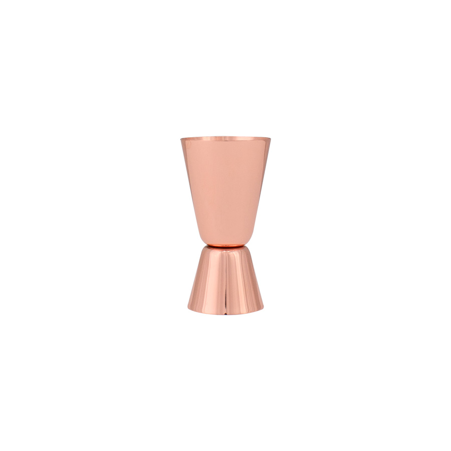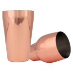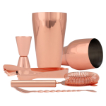 Fino regalo set de cóctel 5-en-1 de Acero inoxidale 304 SS, en acabado color cobre, incluye: coctelera 700ml con tapa 22cm, vaso dosificador doble (jugger) 8.3cm, tenazas para hielo 16cm, cuchara-tenedor revolvedor 23cm, colador/batidor 19cm. Producto BPA FREE, para el contacto con líquidos y alimentos. Capacidad coctelera 700ml. Presentación en caja de regalo de cartón laminado negro. Tamaño: Coctelera D8.7 x H22 cm. / Caja 10.6 x 10.6 x 23.6 cm. •Capacidad: 700 cc