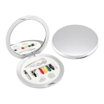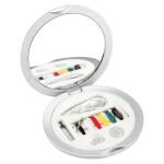 Set de Costura plateado redondo con espejo. Presentación en caja plateada de cartón. Set Ø 6.9 cm / Caja 7 x 6.8 cm.