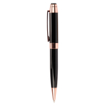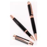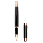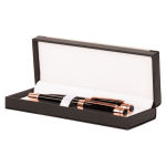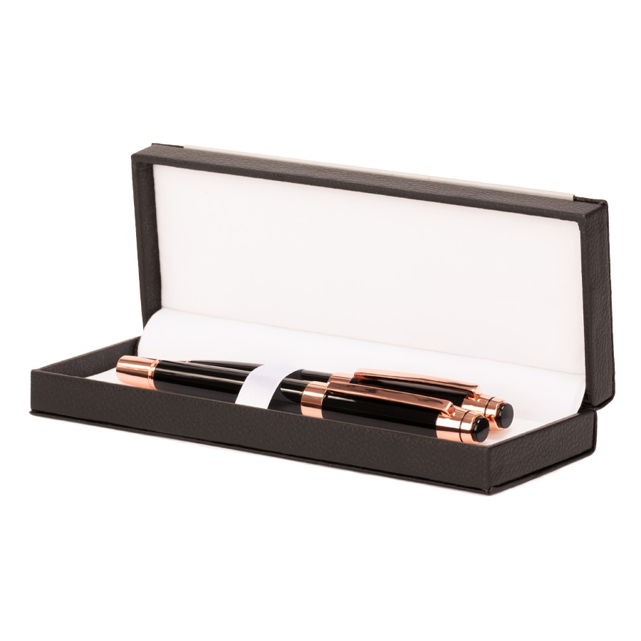 Set de Escritura «THORTON», incluye Bolígrafo metálico negro con terminales encobrizados + Roller pen metálico negro con terminales encobrizados. Presentación en elegante estuche de PU negro con ribete metálico plata opaco bruñido, interior cuna aterciopelada blanca. Sobre funda de papel color negro.