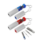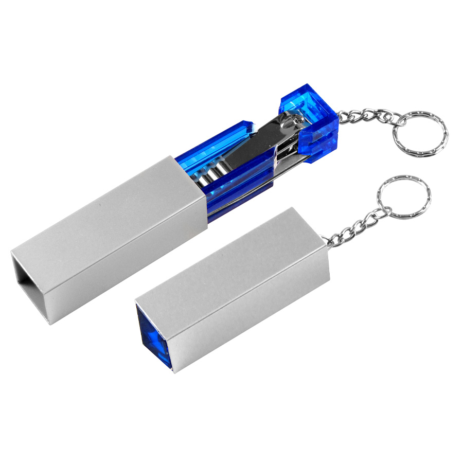 Set de Manicure con Llavero, en tubito rectangular plateado.6.5 x 2.1 x 2.1 cm.