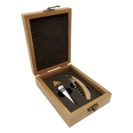 Set de vino en caja de bambú que incluye sacacorchos y tapón hermético para vino. Presentación en caja de cartón duro negra.