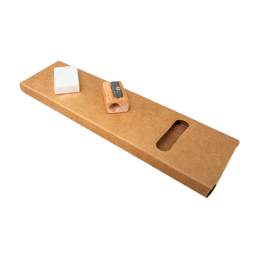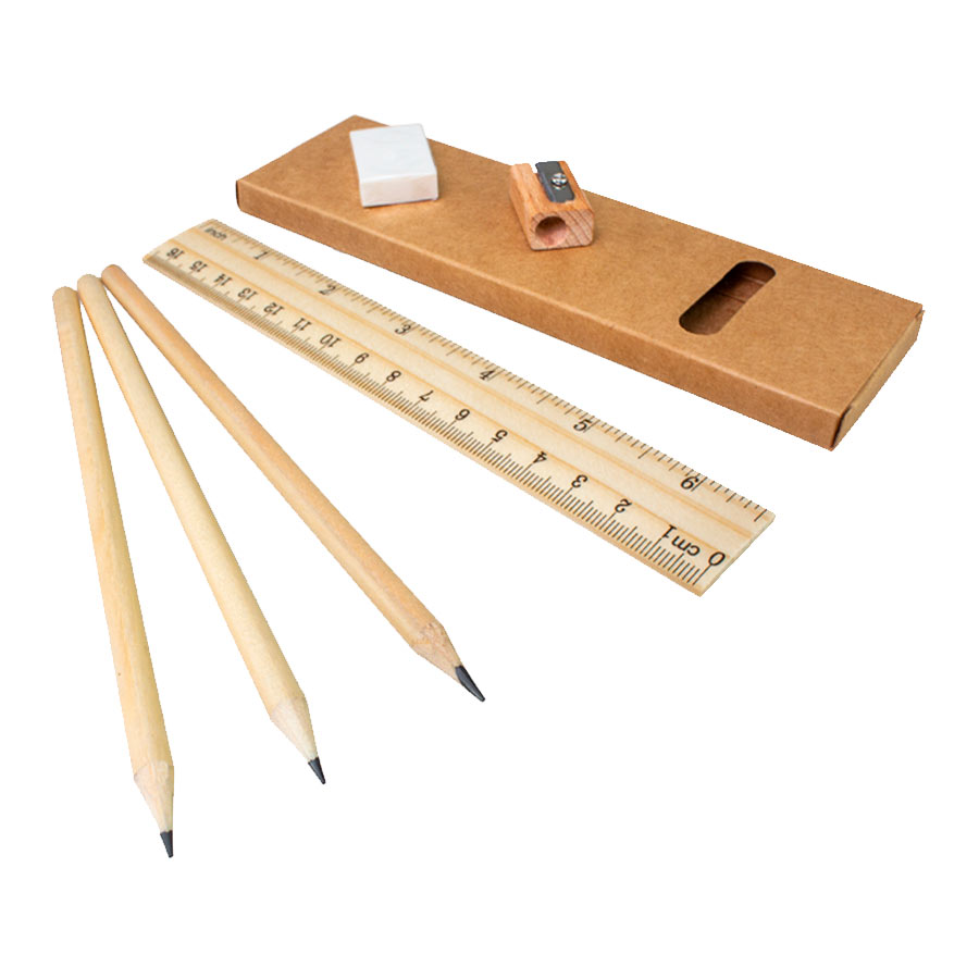 Set Escolar Ecológico. Incluye 3 lápices grafito negro largos de madera + 1 regla de 16.5 cm. de madera + 1 sacapuntas de madera + 1 goma de borrar. Presentación en Estuche ecológico de cartón reciclado. Tamaño: 17.7 x 4.5 x 1.3 cm.