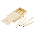 Set de 6 Lápices de Colores con cuerpo hexagonal de Madera natural. Presentación en delicado estuche de Madera natural con tapa corrediza. Tamaño: 10 x 5.5 x 1.5 cm.