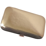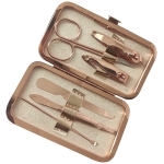 Set de Manicure encobrizado con funda símil cuero. Incluye cortauñas de manos y de pies, pinzas, tijeras, lima y utensilio. Presentación en caja individual de cartón blanco.