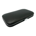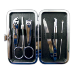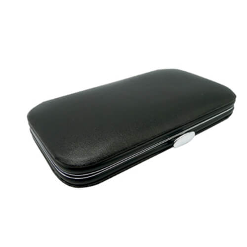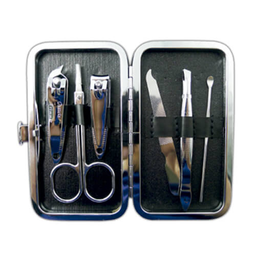 Set de Manicure plateado con funda simil cuero color negro. Incluye cortauñas de manos y de pies, pinzas, tijeras, lima y utensilio. Presentación en caja individual de cartón blanco. Cortauñas de mano largo 5 cms. Cortauñas de pies largo 6 cms. Pinzas de largo 8,4 cms. Tijeras de 8,3 cms. Lima de uñas de largo 8,2 cms. Utensilio largo 8,2 cms.
