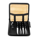 Set parrillero BBQ que incluye tabla de madera para picar, utensilios y destapador. Presentado en estuche funda de poliéster 600D con cierre metálico. Presentación en bolsa plástica.