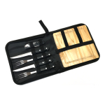 Acero Inoxidable 420, Mango PP. 1 destapador multiuso 11 cms. 2 cuchillos de carne 21 cms x 1.00 mm. 2 tenedores de 20 cms x 1.20 mm. Tabla de cortar madera Pino 20 cms x 20 cms x 1,2 cms. Funda de Poliéster 600D.