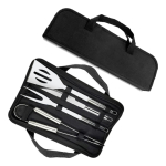 Set parrillero BBQ que incluye espátula, cuchillo parrillero, pinzas y tenazas. Presentado en estuche funda de poliéster 600D con cierre metálico.