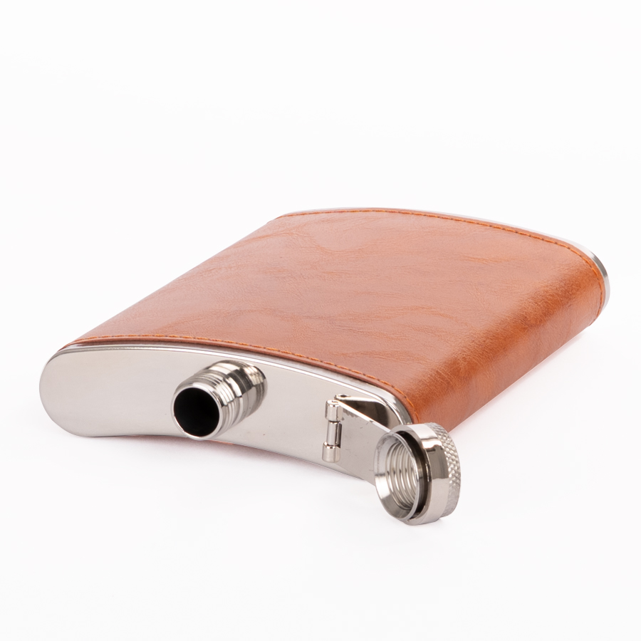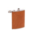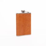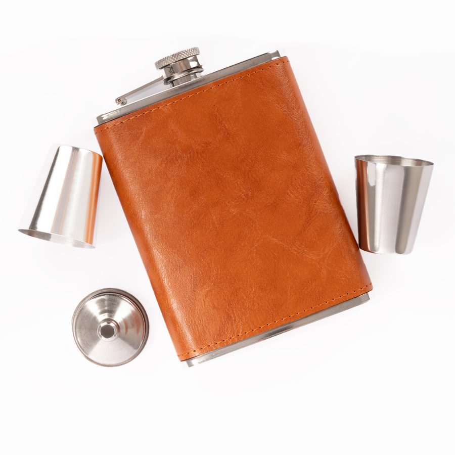 Set Petaca Licorera con cubierta de eco-cuero café claro (color caramelo) + 2 vasitos + 1 embudo de Acero Inoxidable SS304, modelo «OXFORD». Capacidad Petaca 8 oz (237 ml). Presentación en elegante estuche de cartón forrado negro con tapa. Interior cama aterciopelada negra. Tamaño: 19.4 x 17.4 x 4.3 cm.