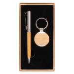 Set de Regalo «UMPIRE», incluye llavero metálico CON APLICACIÓN DE bAMBOO + Bolígrafo metálico plateado con grip de Bamboo, escritura azul. Presentación en elegante caja de carton color natural con tapa, interior cuna de EVA aterciopelada negra. Sobre funda de papel color natural.